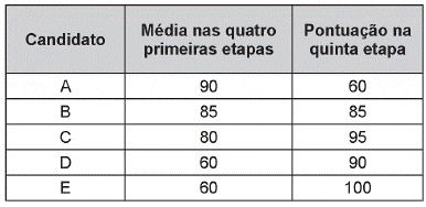 (Enem 2015) Um concurso é composto por cinco etapas. Cada etapa vale 100 pontos. A pontuação final de cada candidato é a média de suas notas nas cinco etapas. A classificação obedece à ordem decrescente das pontuações finais. O critério de desempate baseia-se na maior pontuação na quinta etapa.